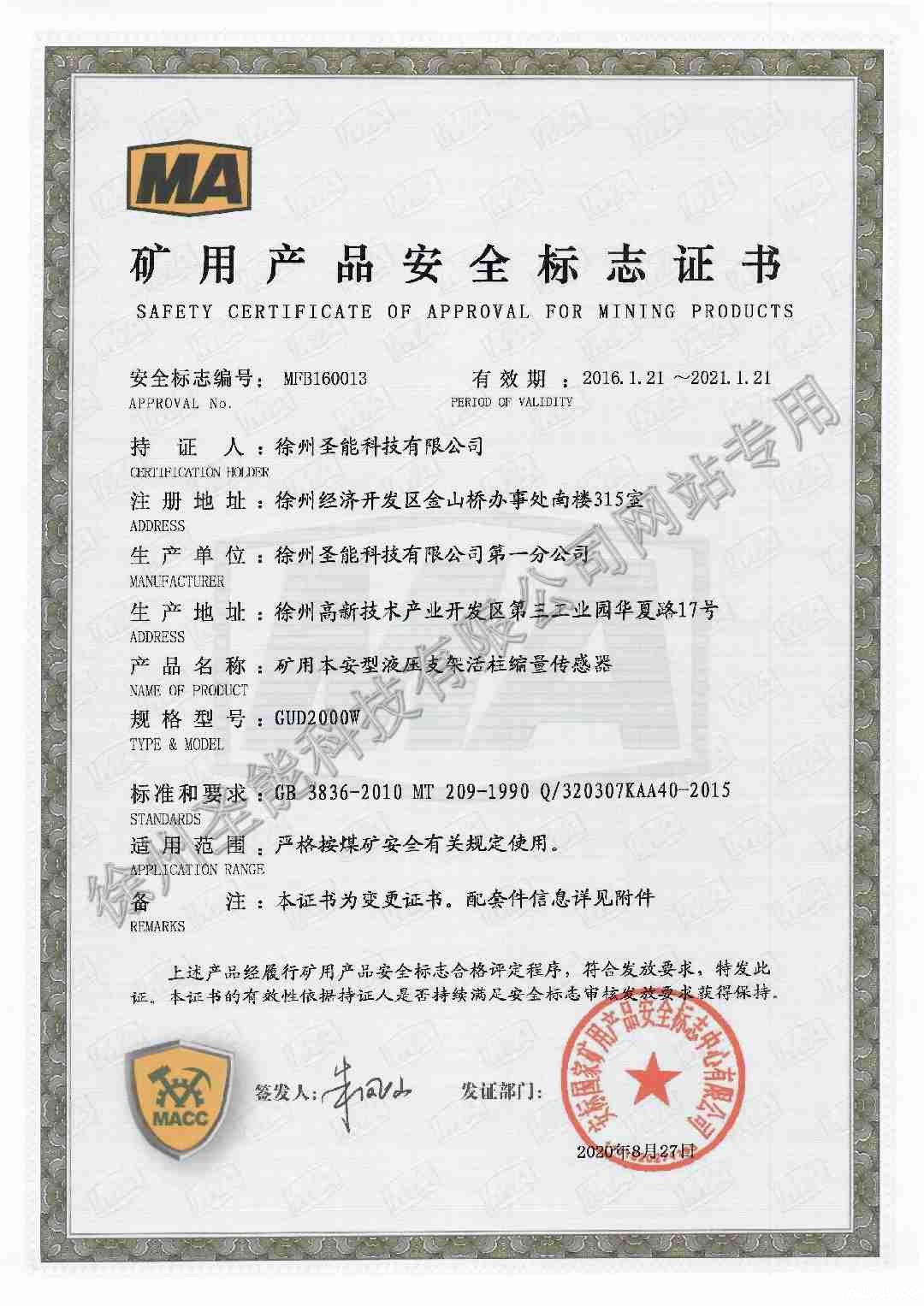 GUD200W矿用本安型液压支架活柱缩量传感器煤安证