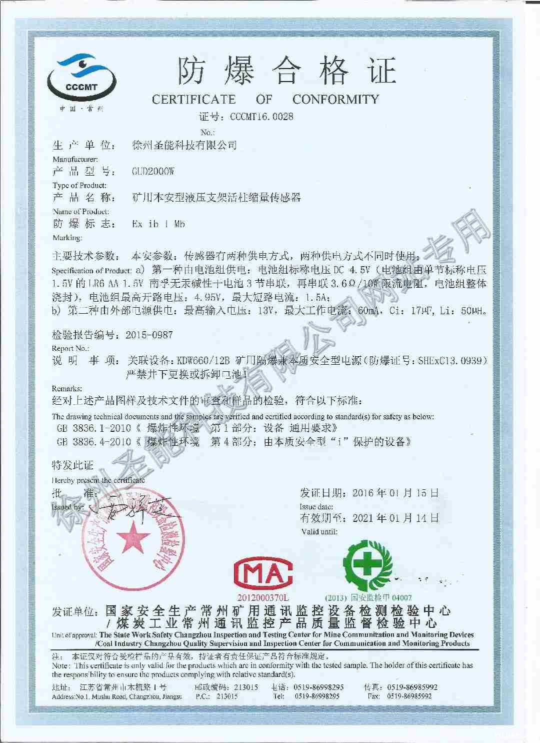 GUD200W矿用本安型液压支架活柱缩量传感器煤安证