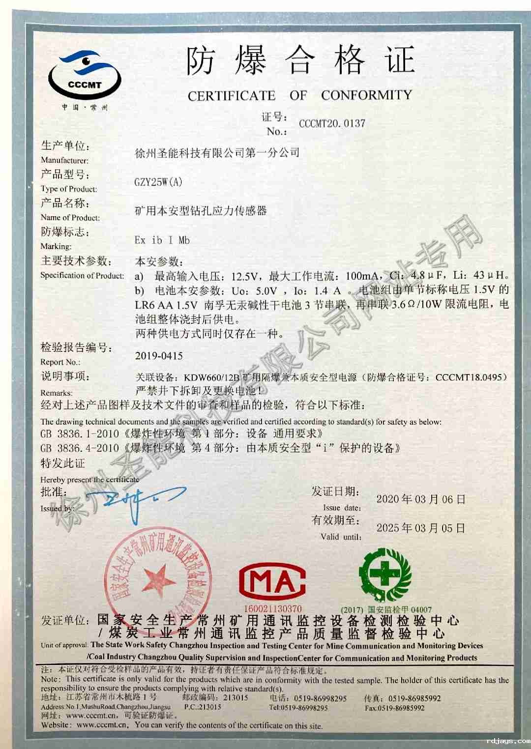 GZY25W(A)矿用本安型钻孔应力传感器防爆证