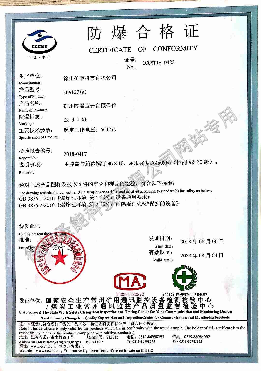 KBA127(A)矿用隔爆型云台摄像仪防爆证