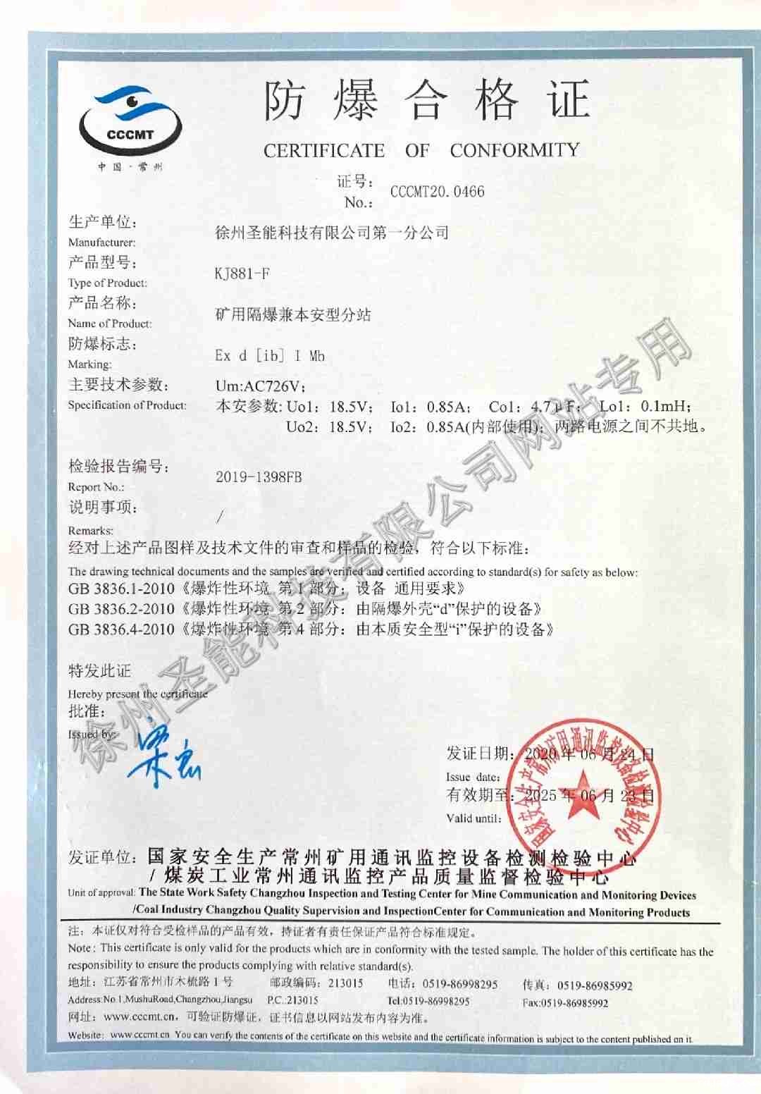 KJ881-F矿用隔爆兼本安型分站防爆证