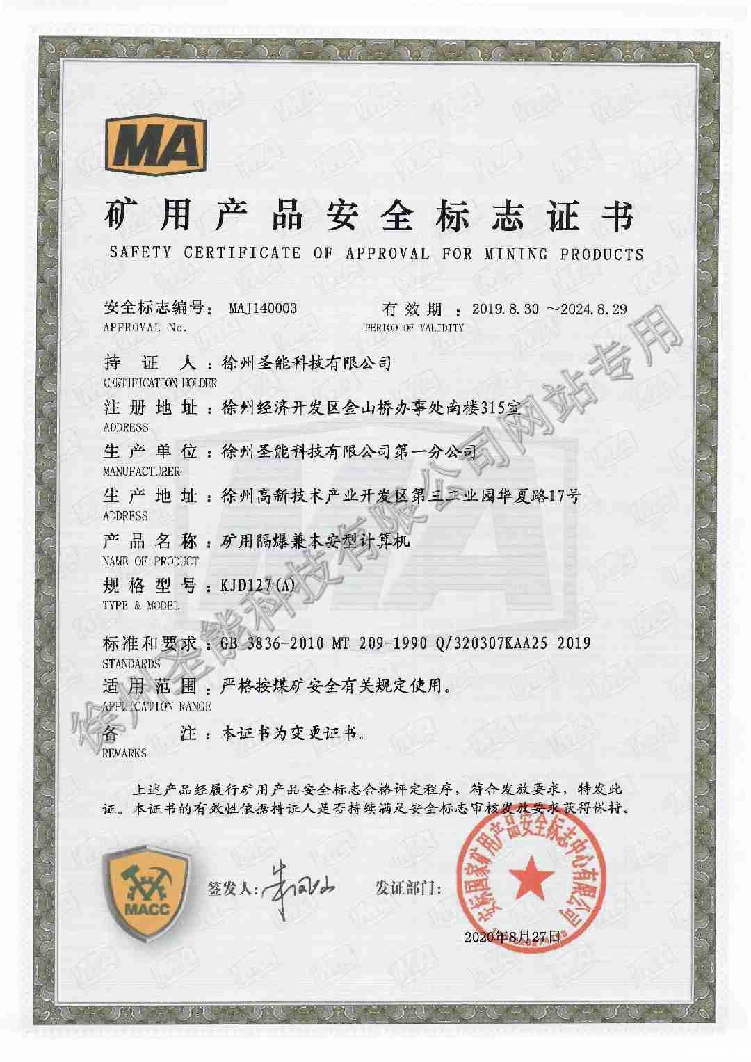 KJD27(A)矿用隔爆兼本安型计算机防爆证