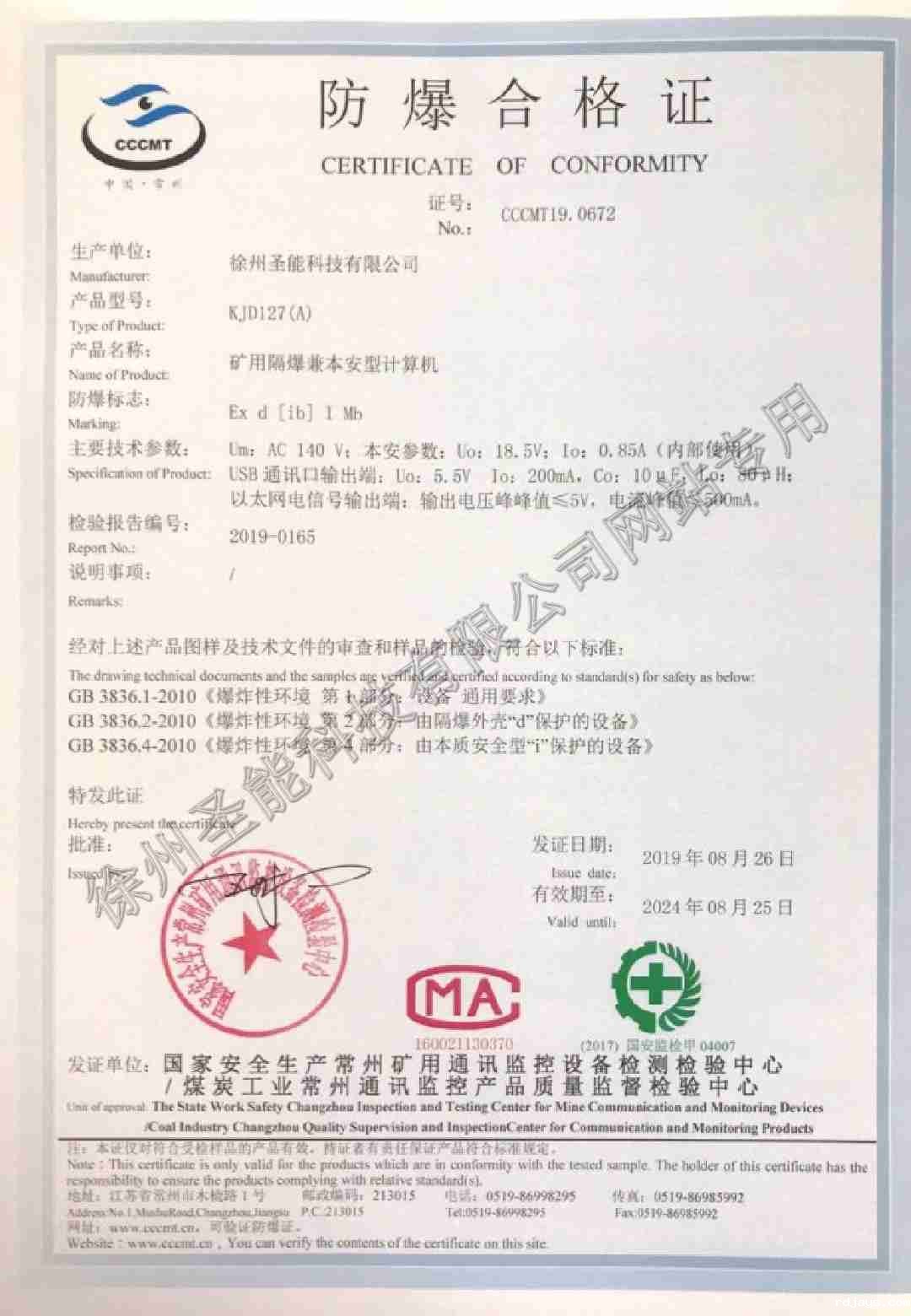 KJD27(A)矿用隔爆兼本安型计算机防爆证