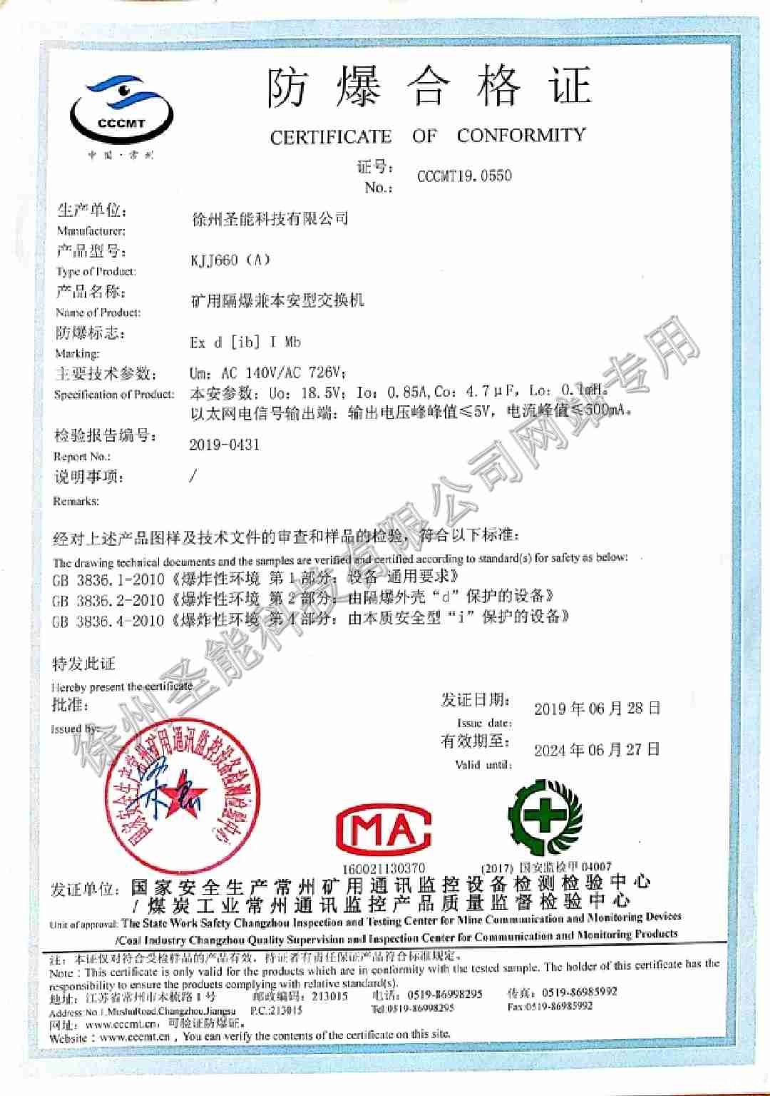 KJJ660(A)矿用隔爆兼本安型交换机煤安证