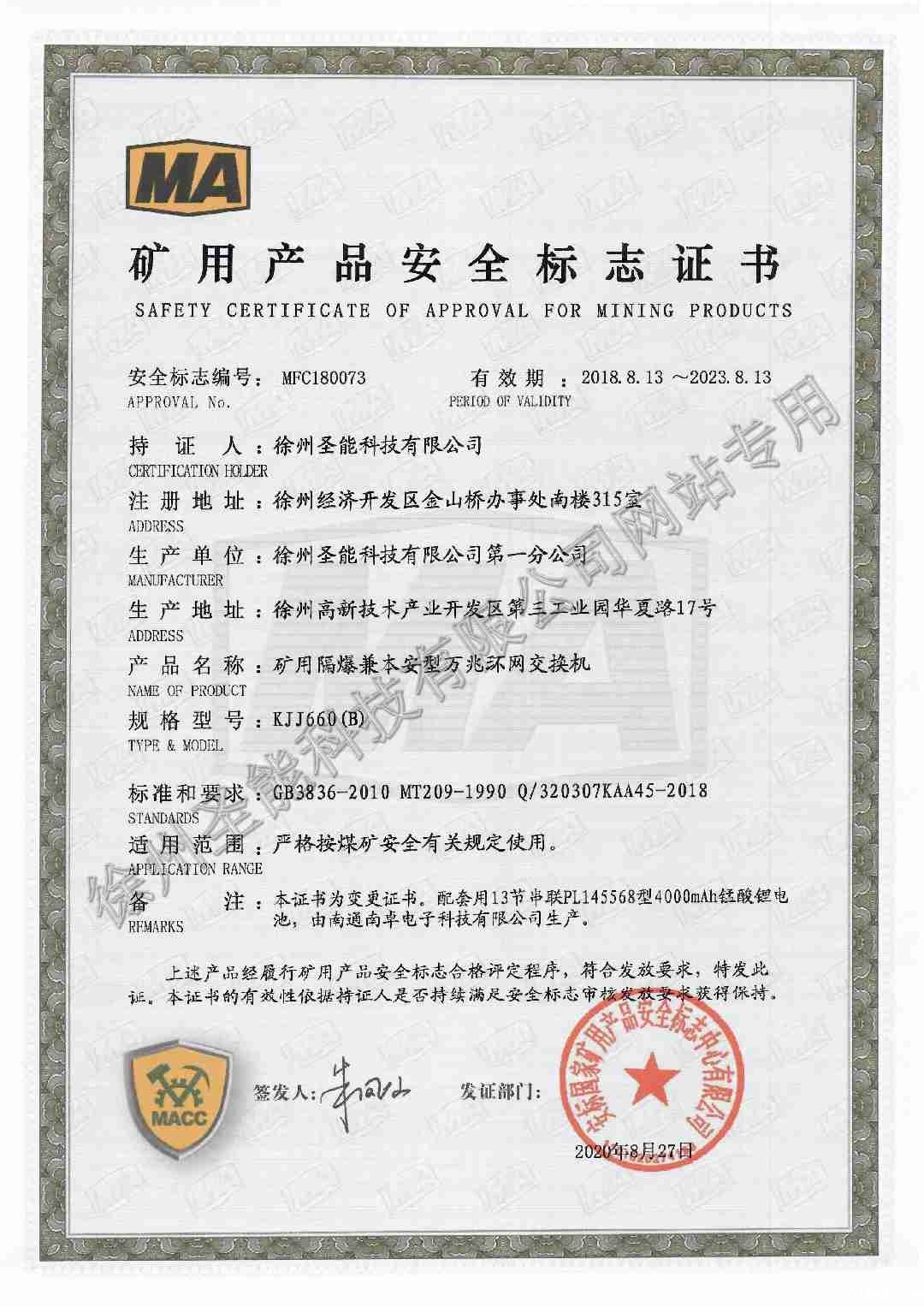 KJJ660(A)矿用隔爆兼本安型交换机防爆证