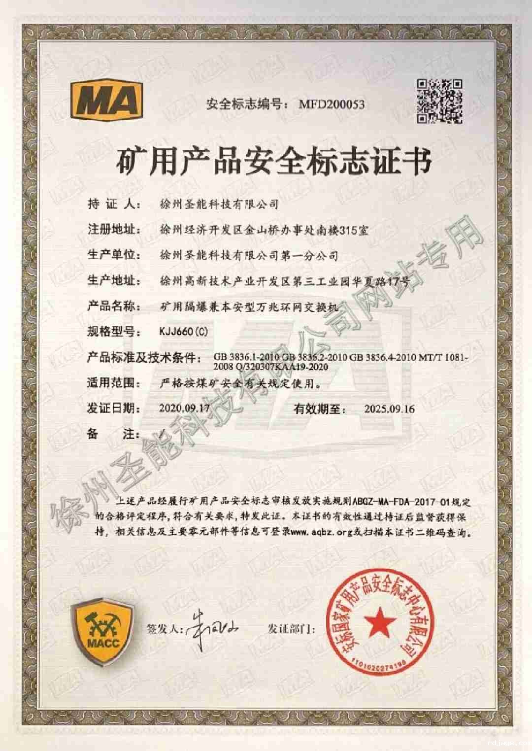 KJJ660(C)矿用隔爆兼本安型万兆环网交换机防爆证
