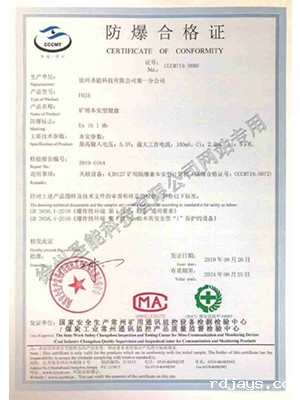 • 防爆标志:Exd[ib] I Mb 煤安标号:MFA140003 防爆证号:CCCMT14.0001 执行标准:Q/320307KAA25-2013