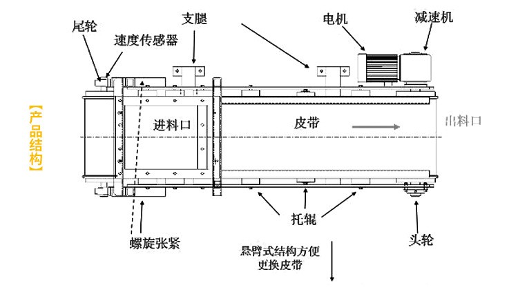 7)下料斗:完成从料仓向皮带上均匀供料,调节闸门开度,可改变皮带上料层厚度;
