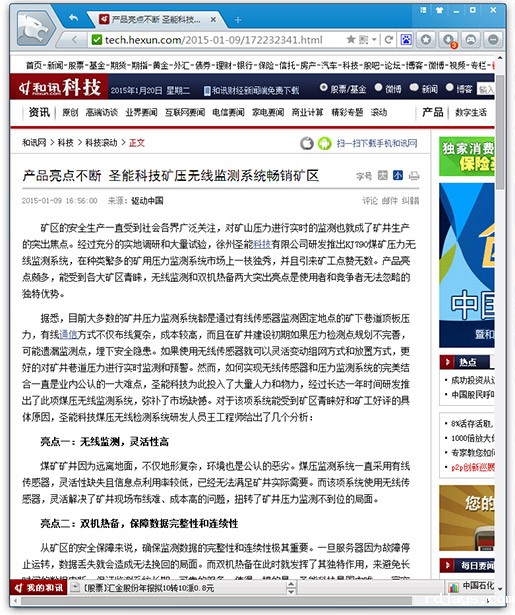 我司经多年研发隆重推出的KJ790煤矿压力无线监测系统获客户及权威机构好评,知名媒体《和讯网》对此进行了深入报道。