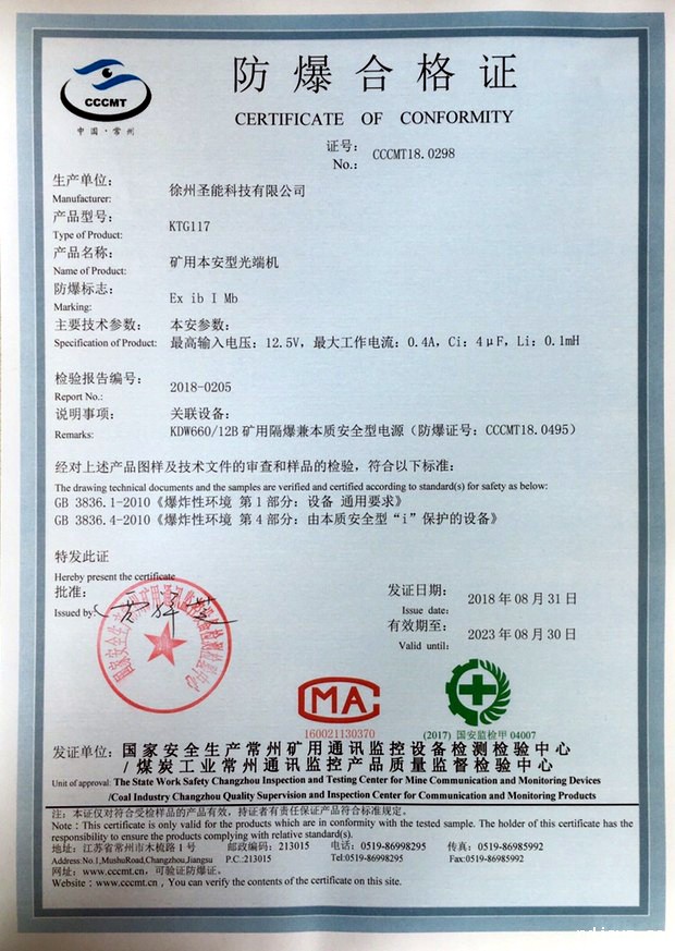 | KTG117(A) | 矿用本安型光端机 | Exib I | 直流DC12V | ≤800mA | BNC接口,同轴电缆模式 | 1 | 1 | 1 | 338mm ×295mm×105mm | 约4.8kg |