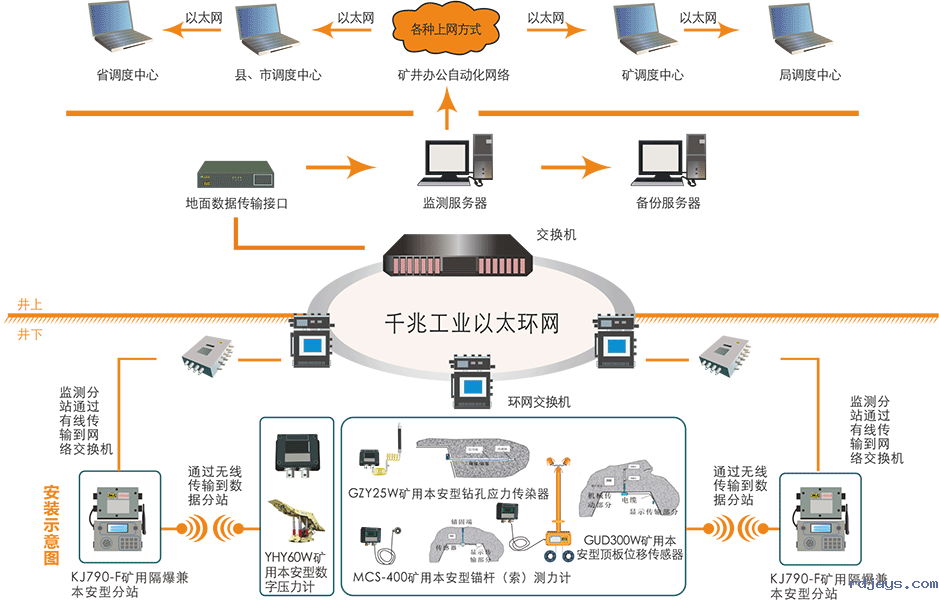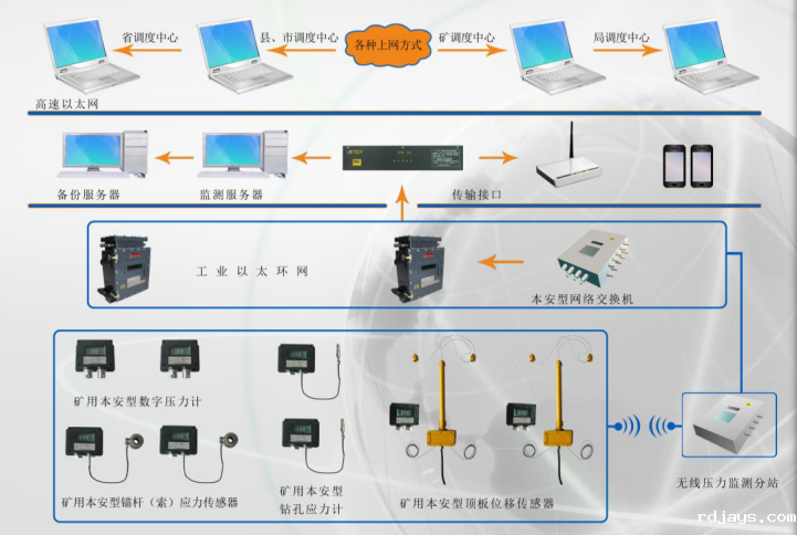 该系统主要由KJ453矿用隔爆兼本安型分站、YHY60W(A)矿用本安型数字压力计、GUD300W(A)矿用本安型顶板位移传感器、MCS-40(A)0矿用本安型锚杆(索)测力计、GZY25W矿用本安型钻孔应力传感器、GUD2000W(A)矿用本安型液压支架活柱缩量传感器以及《煤矿压力监测系统》软件等几部分组成。